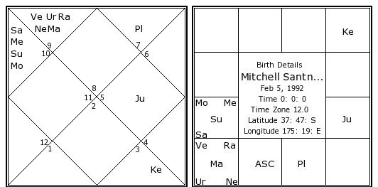 सूर्य दसवें भाव का स्वामी भी है और उसी भाव पर दृष्टि कर रहा है, इसलिए साफ है कि जान्हवी यहाँ लंबे समय तक टिकने वाली हैं। मंगल, जो लग्नेश है, बहुत मज़बूत स्थिति में है और ग्यारहवें भाव (लाभ) में बैठा है। इसके साथ राहु भी है, और यहां राहु उनके लिए सकारात्मक काम करता है। इसी वजह से उन्हें अपने क्षेत्र में दूसरों के मुकाबले थोड़ा एक्स्ट्रा फायदा मिला है। इस सेक्शन की दूसरी कुंडली न्यूजीलैंड के T20 क्रिकेट कप्तान और इंटरनेशनल स्टार मिशेल सैंटनर की होगी।